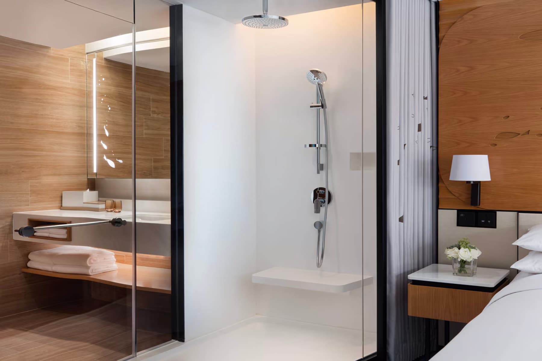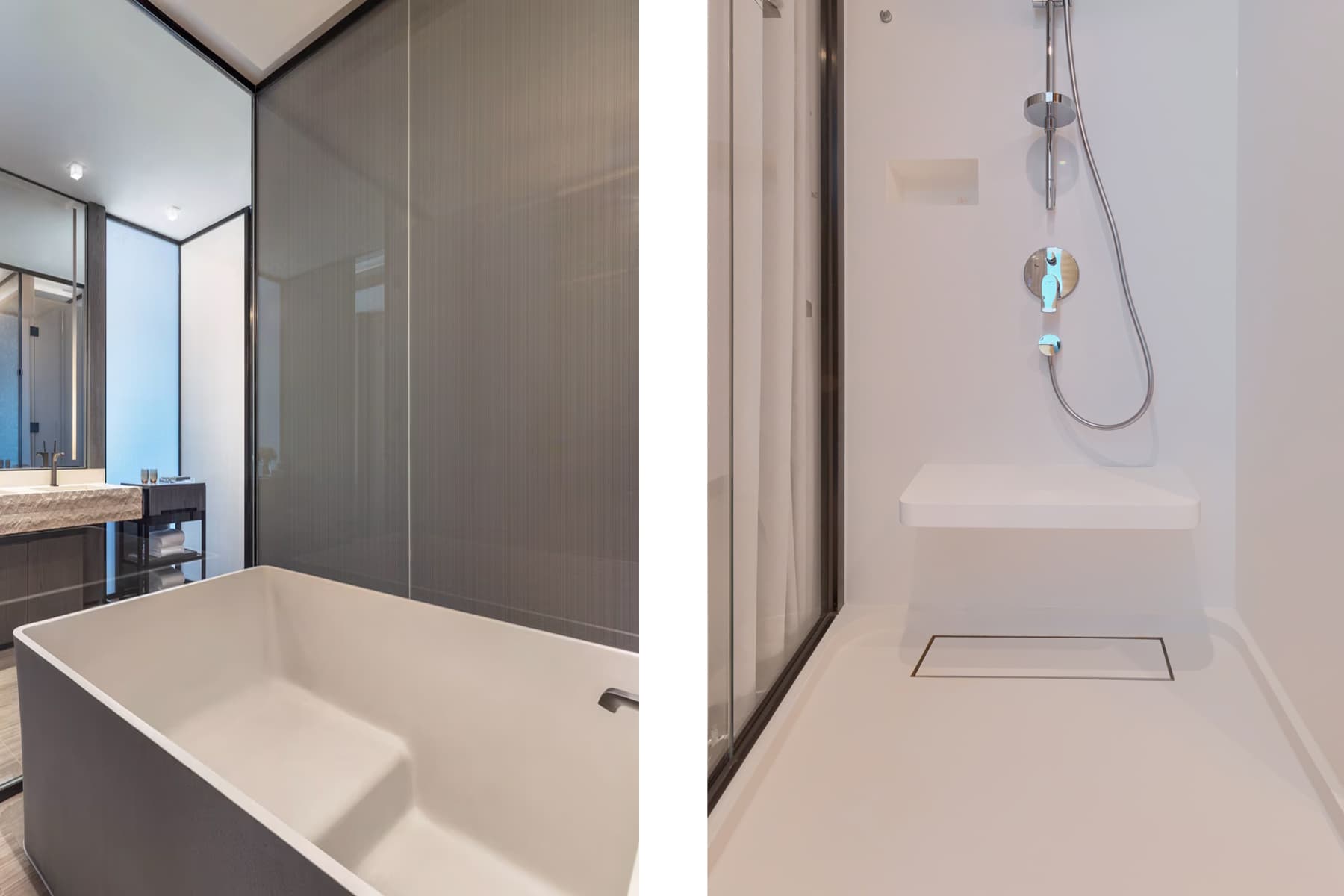 Rooms in the Marina Wing are equipped with bespoke MarbleForm™ seamless shower rooms and relaxed baths, while the Club Wing boasts a bespoke soaking tub with an integrated bench in Sahara, finished in natural tones, creating a true sanctuary.