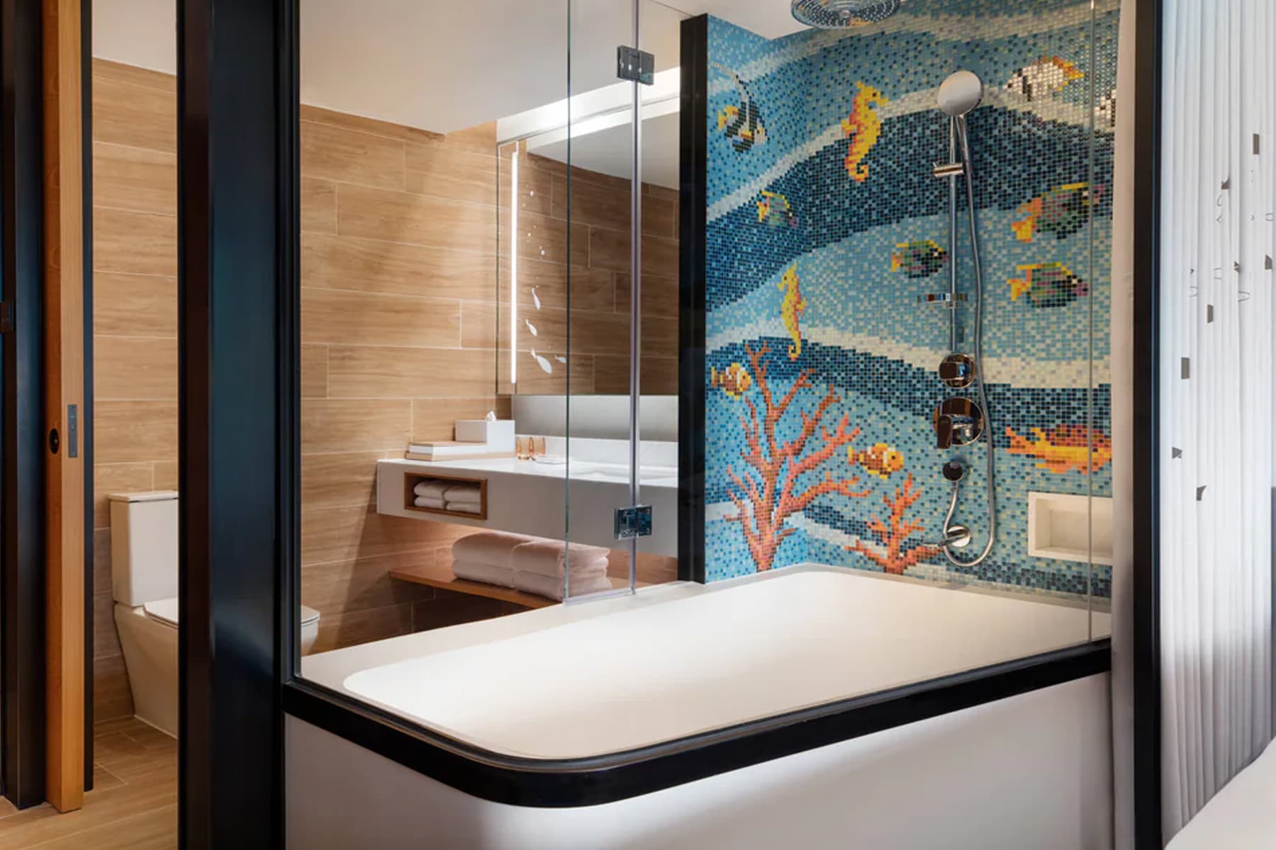 The hotel’s façade features energy-saving components to maintain cooler temperatures in the summer, along with rainwater collection areas and vertical planting systems throughout. Claybrook’s MarbleForm™ bathware perfectly aligns with this eco-friendly vision.