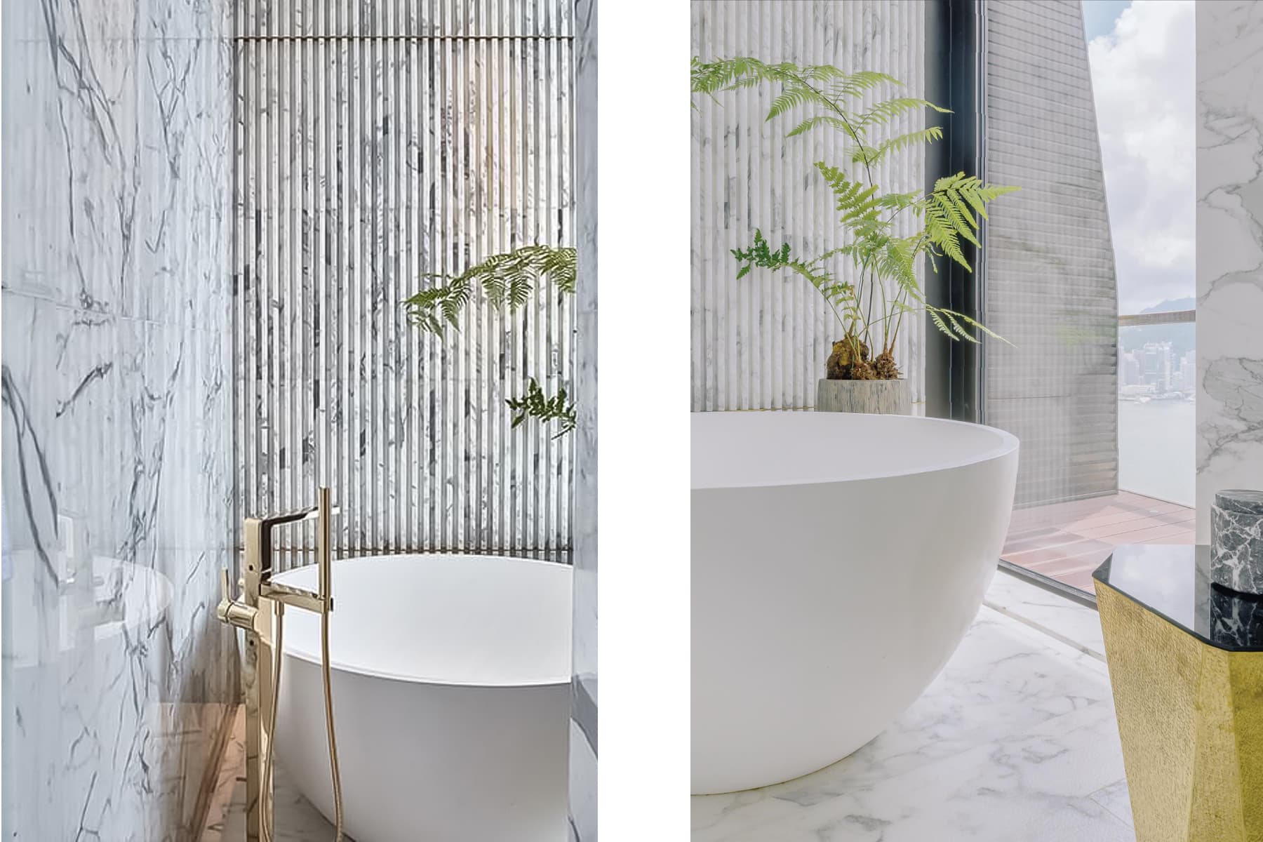 We worked closely with Joyce to realize her vision for the Penthouse bathrooms. Claybrook Soho basins in hand-carved Calacatta Borghini marble and a bespoke freestanding round bath adorn the sumptuous master bathroom with sweeping views of Victoria Harbour.