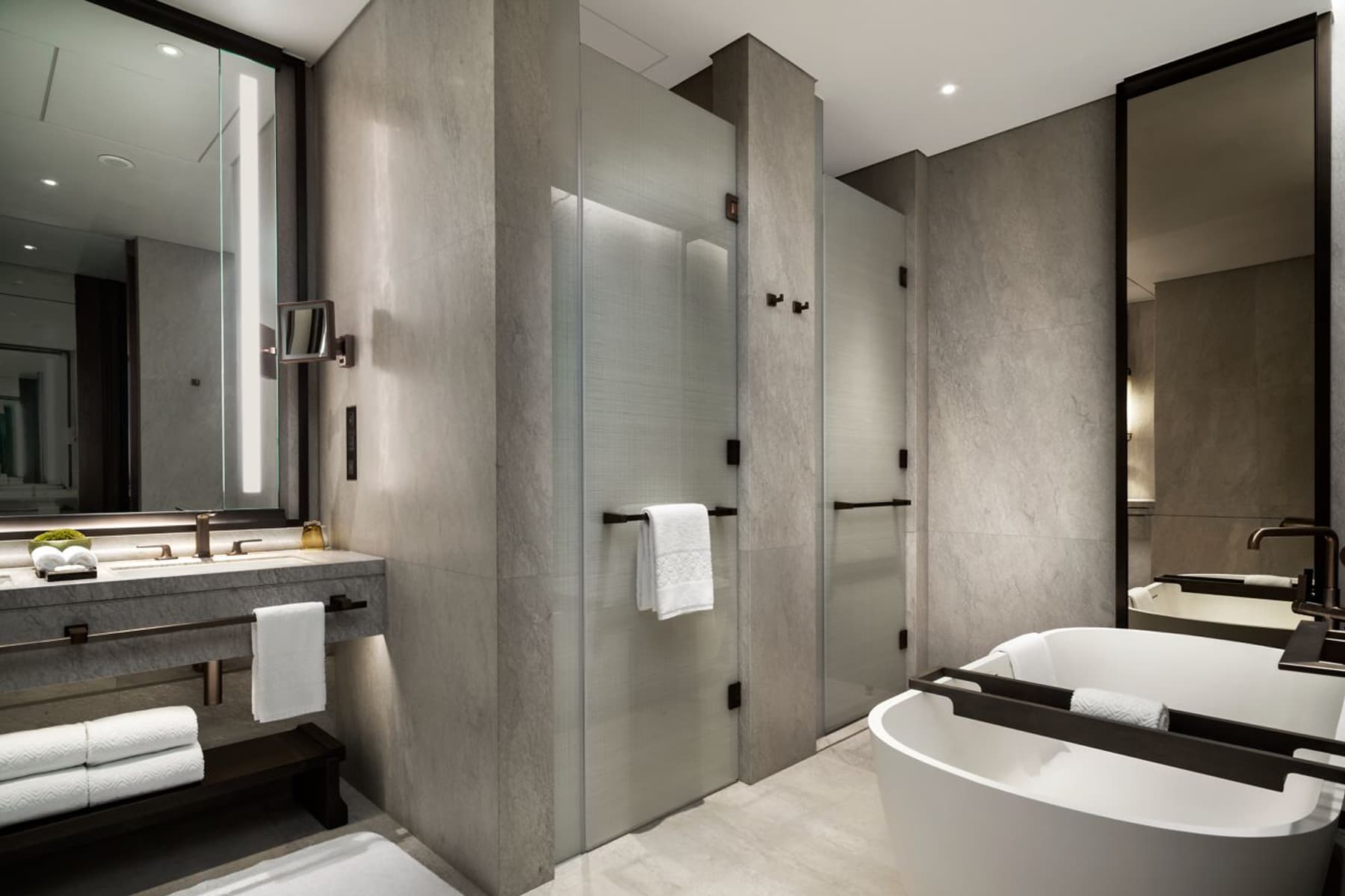 The opulent 250m2 presidential suite features an inviting marble bathroom, at the centre of which is a custom designed round Claybrook soaking tub in Dover White. The organic form of the bath brings a softness to the angular and minimalist interior.