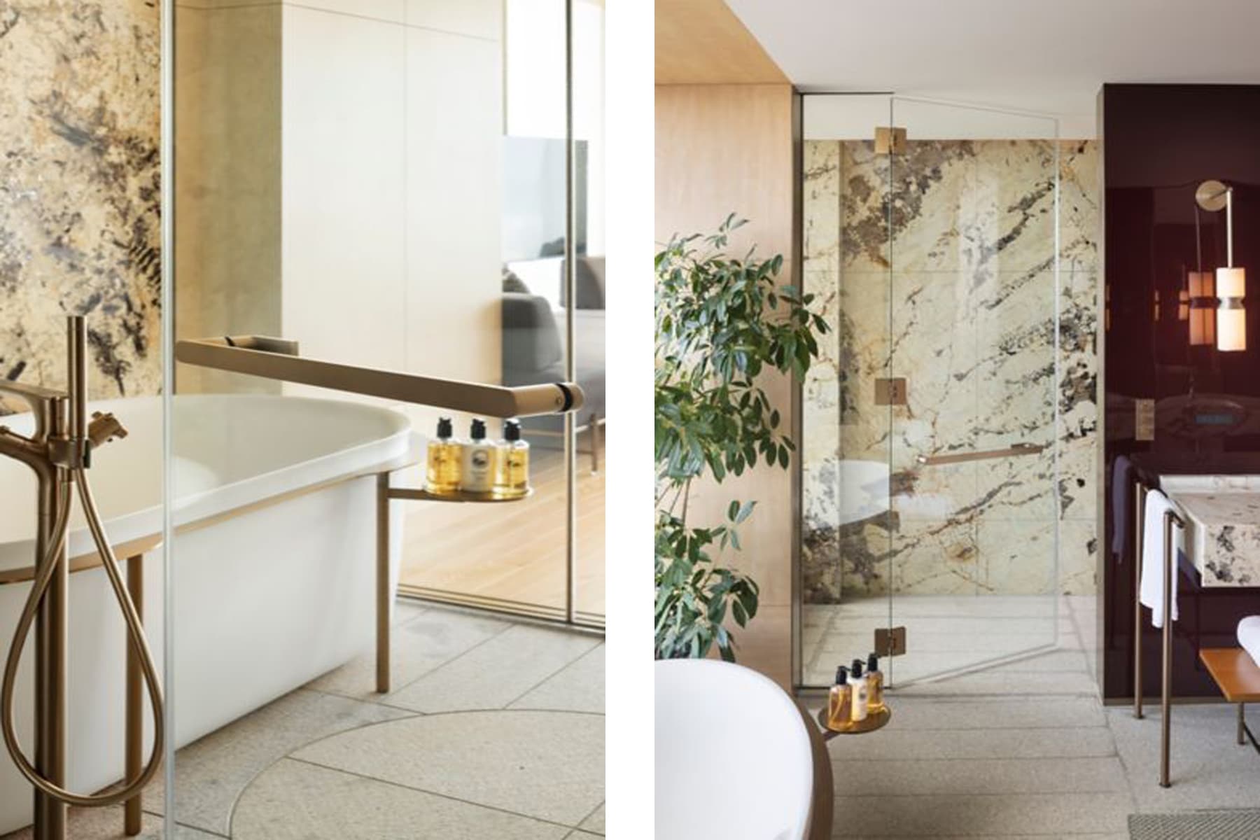 The team at Claybrook worked closely with Layan to help them realize their vision for the bath. Custom-made metalwork frames encase the bath, giving them a sense of being suspended in space. The frames also incorporate shelves for amenities.